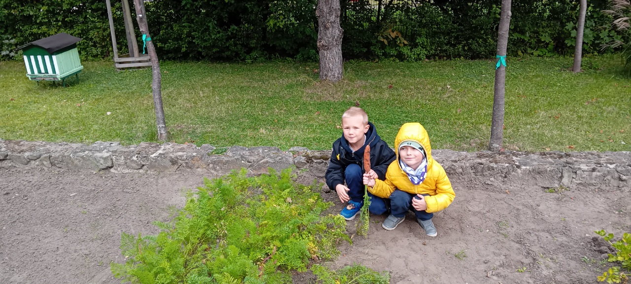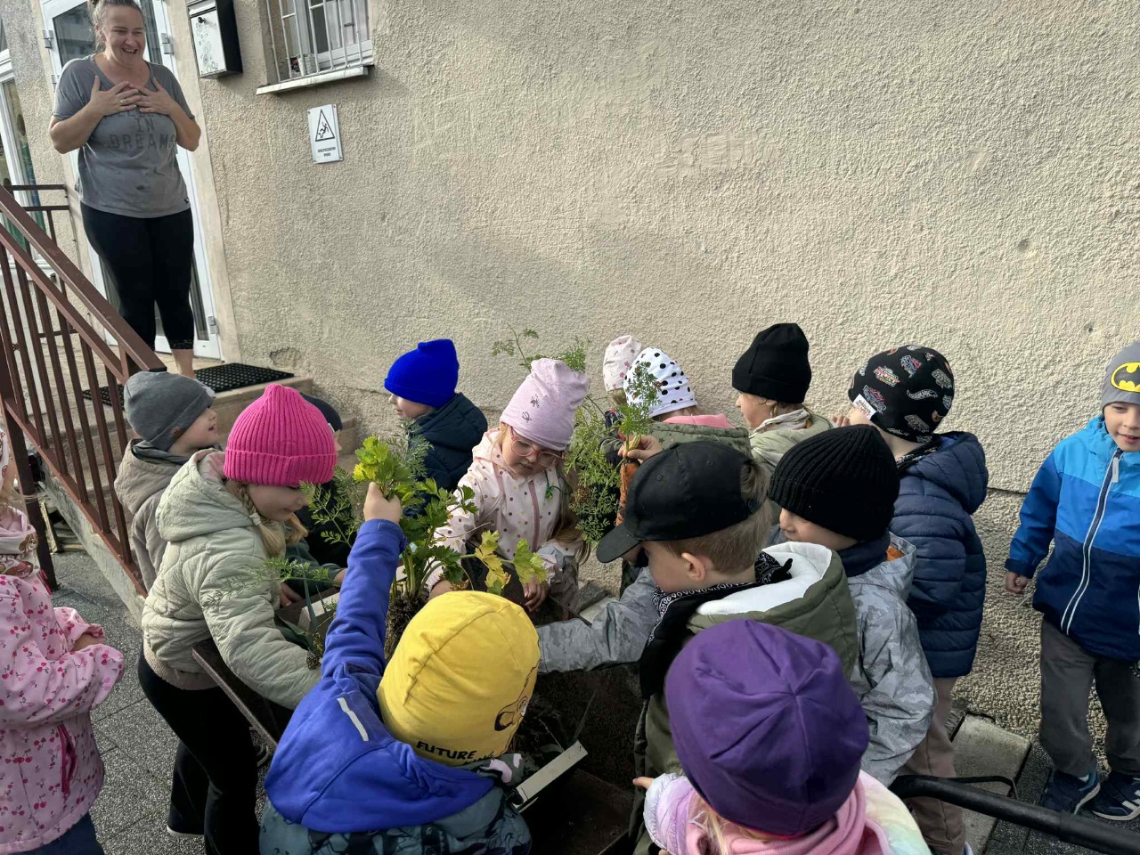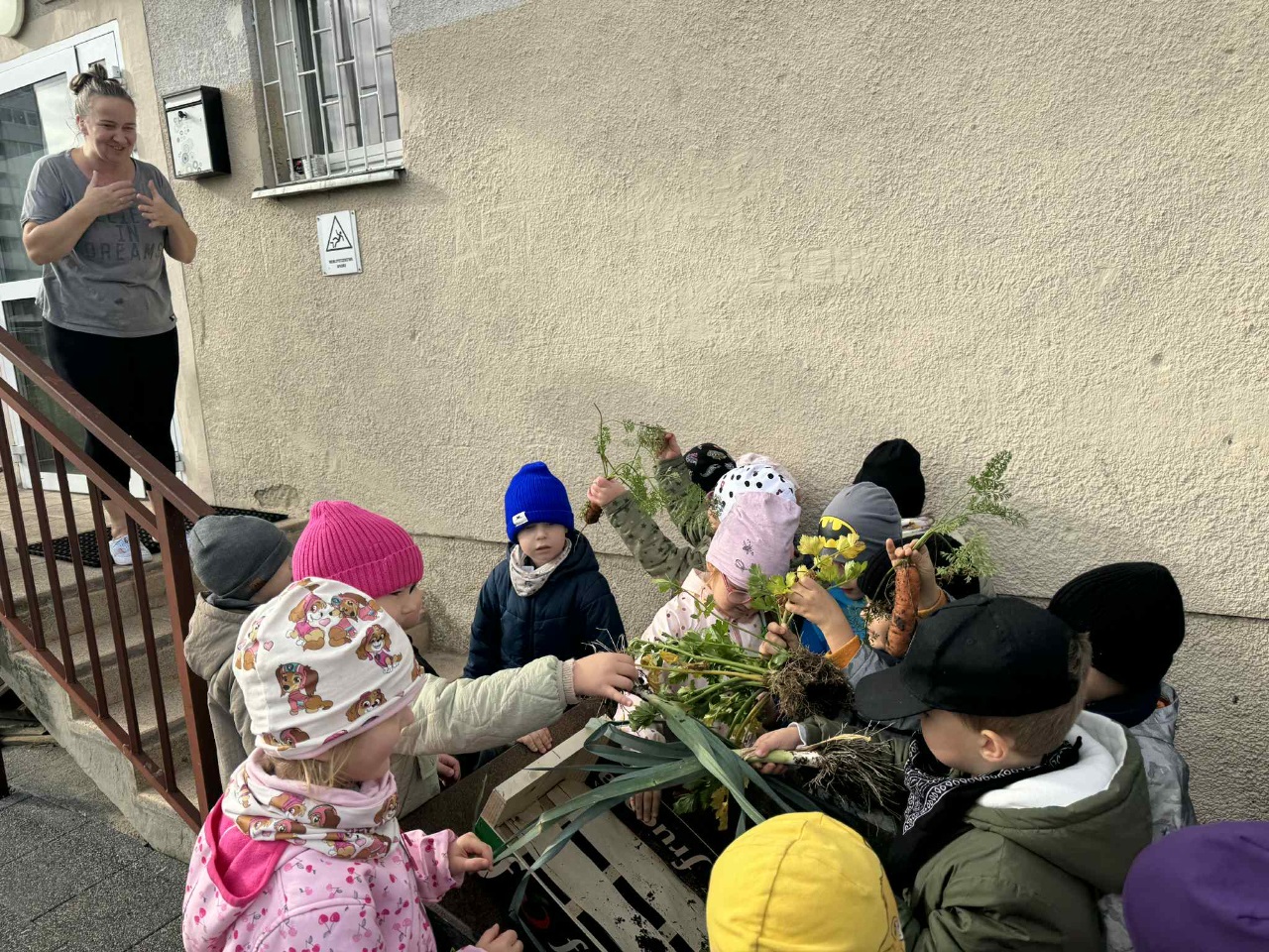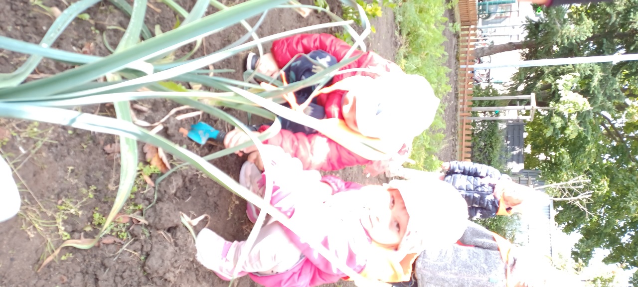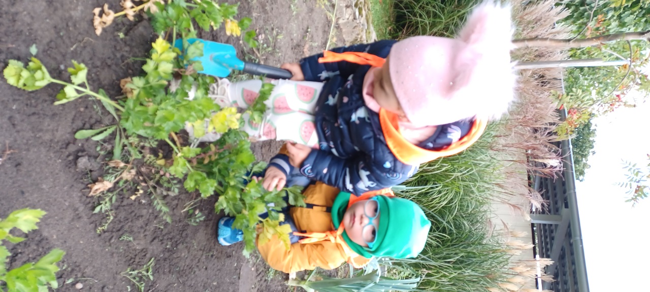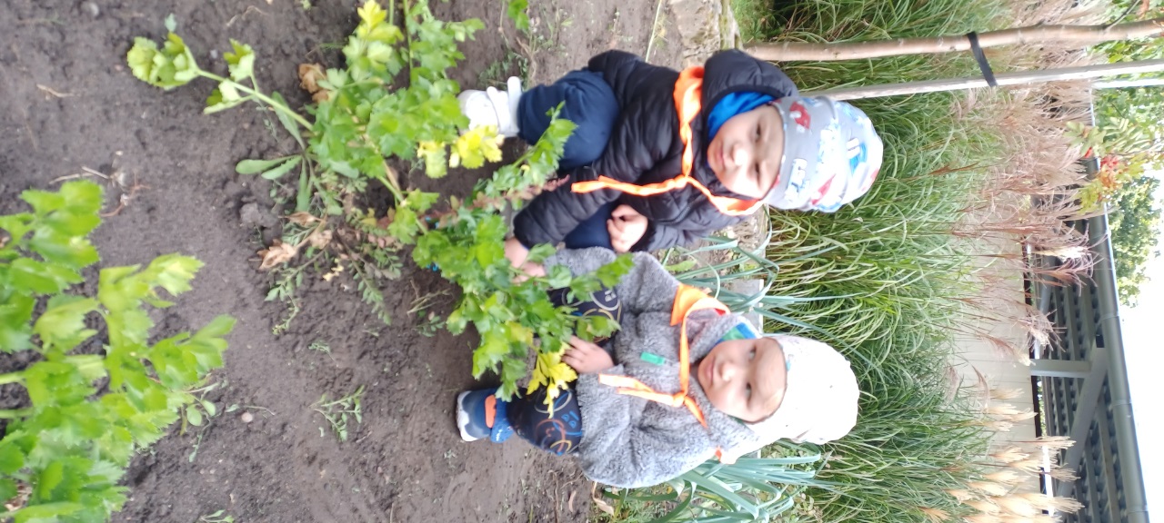 Ekoludki w dniu dzisiejszym zebrały plony z naszego ogródka i przekazały je paniom kucharkom, które jutro ugotują dzieciom pyszny rosołek.