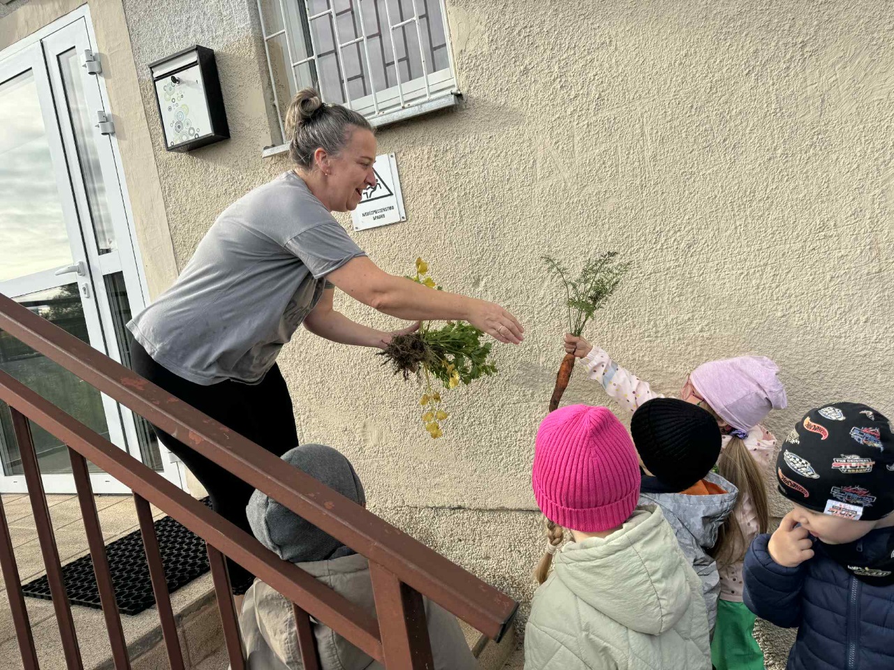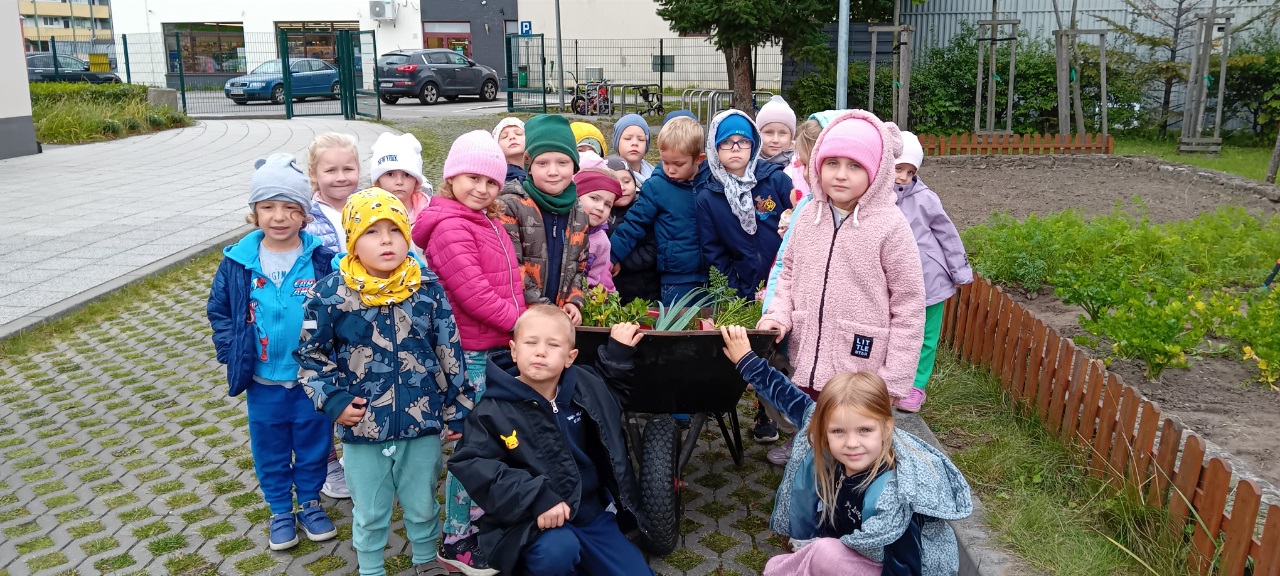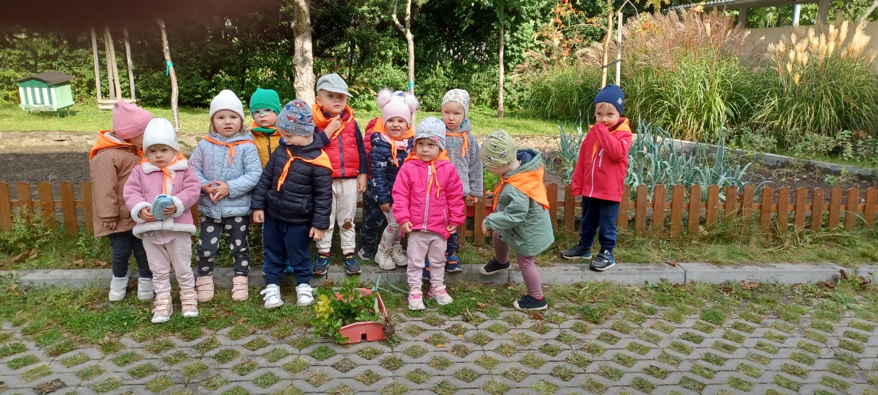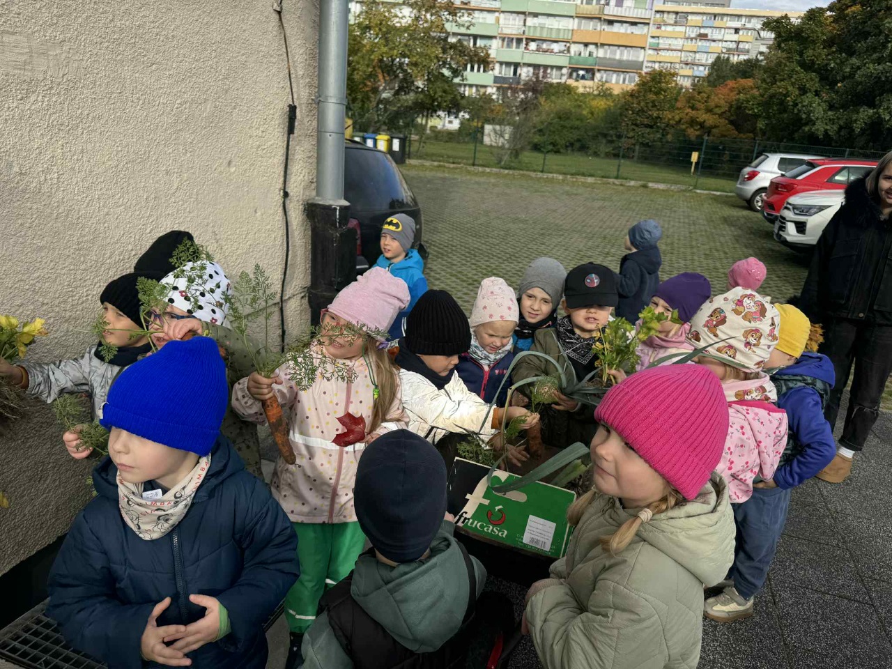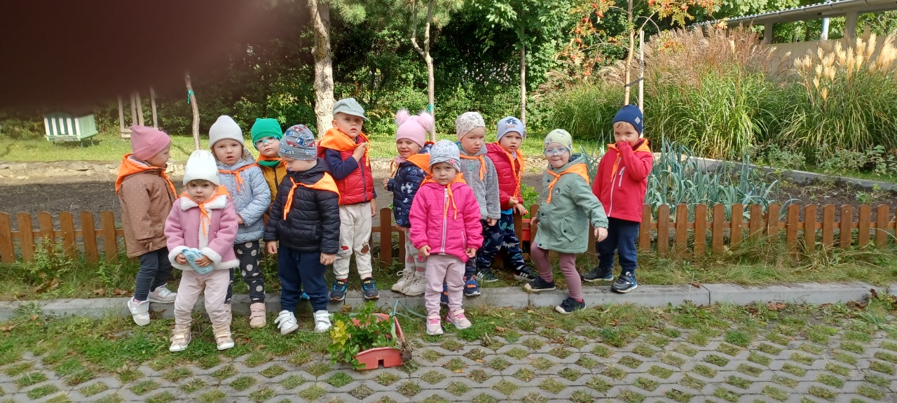 Ekoludki w dniu dzisiejszym zebrały plony z naszego ogródka i przekazały je paniom kucharkom, które jutro ugotują dzieciom pyszny rosołek.