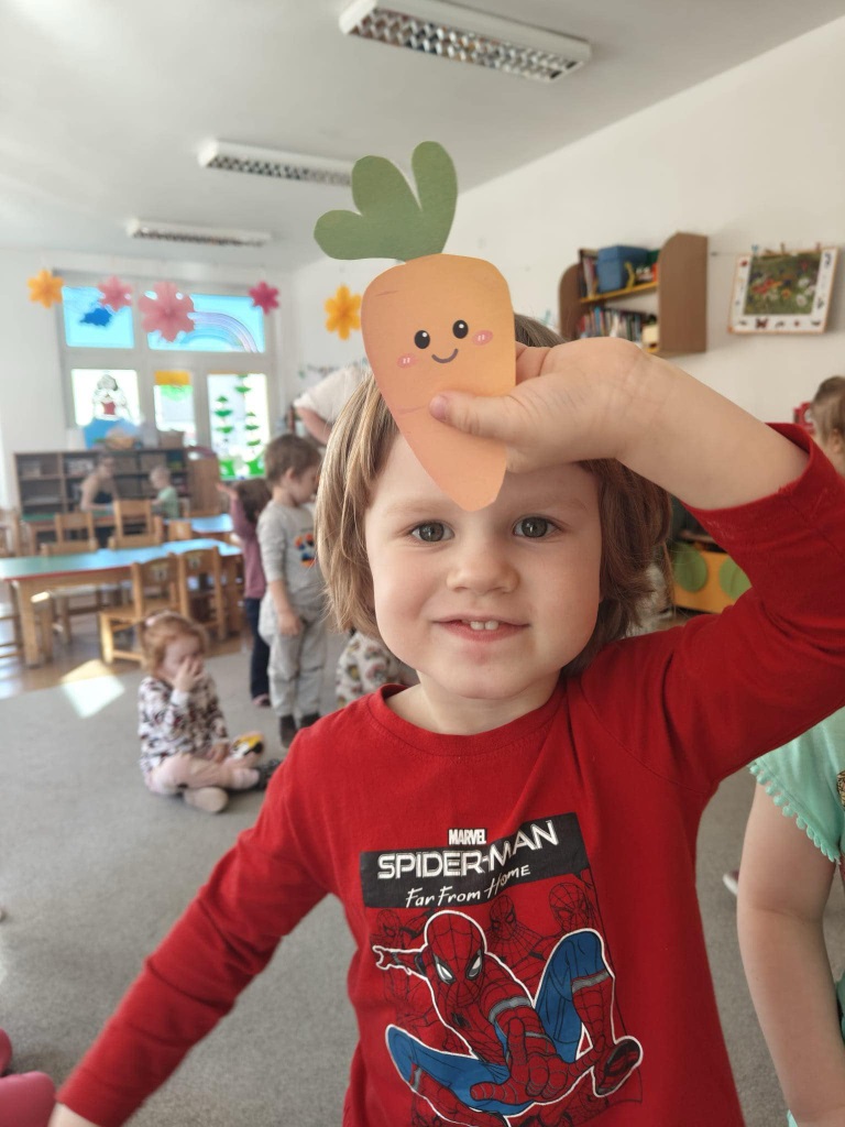 Dziś Krasnoludki obchodziły Dzień Marchewki! Rozmawialiśmy o tym, jak bardzo jest zdrowa i ile ma witamin, szczególnie witaminy A, która wspiera nasz wzrok. Potem bawiliśmy się w „Gorącą Marchewkę”, szukaliśmy marchewek w zabawie „Ciepło – zimno” oraz rzucaliśmy kostką i układaliśmy marchewki według liczby oczek.