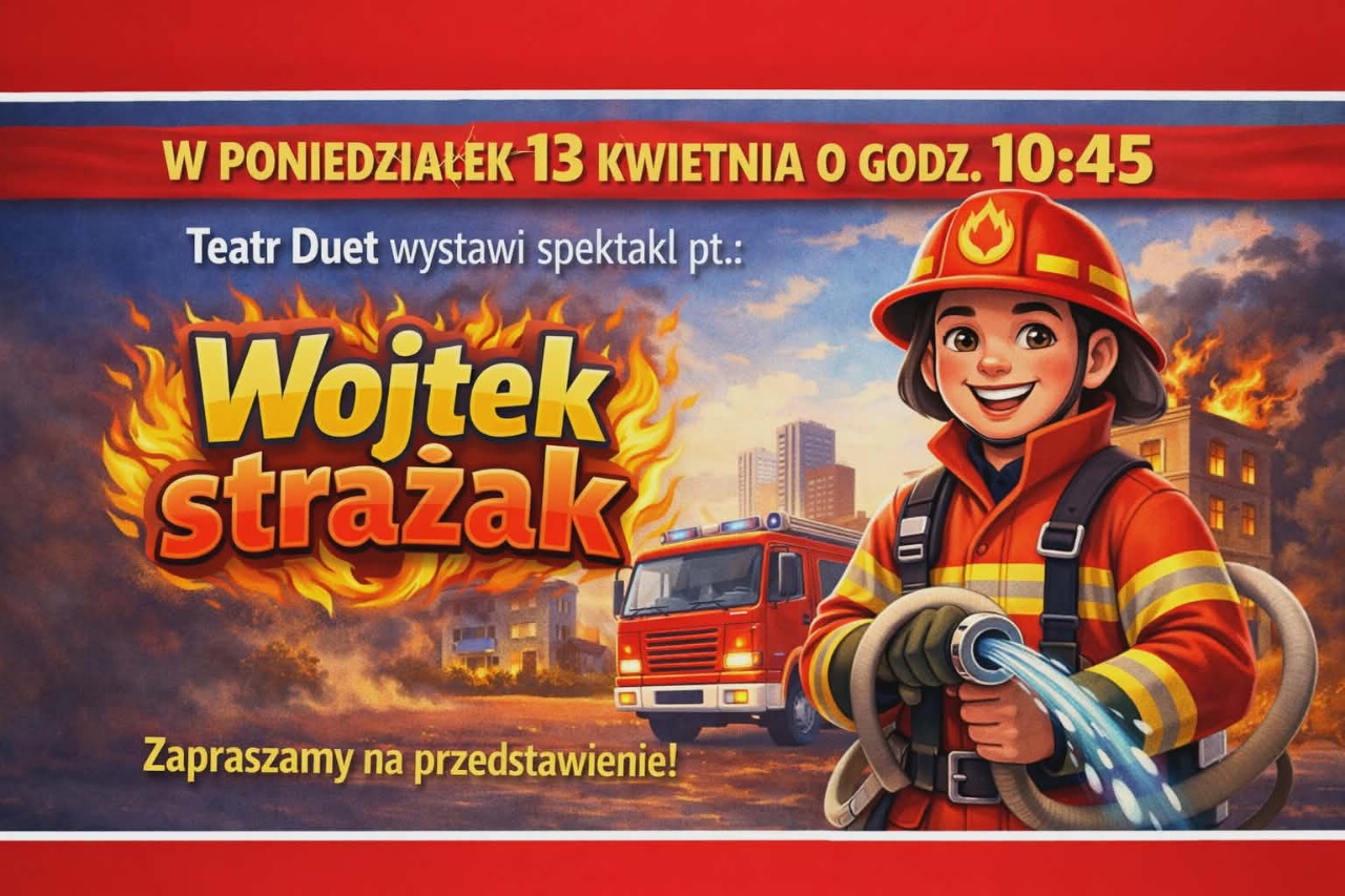 Przedstawienie teatralne pt. "Wojtek strażak" w wykonaniu Teatru Duet przedszkolaki obejrzą w poniedziałek 13 kwietnia o godz. 10.45.