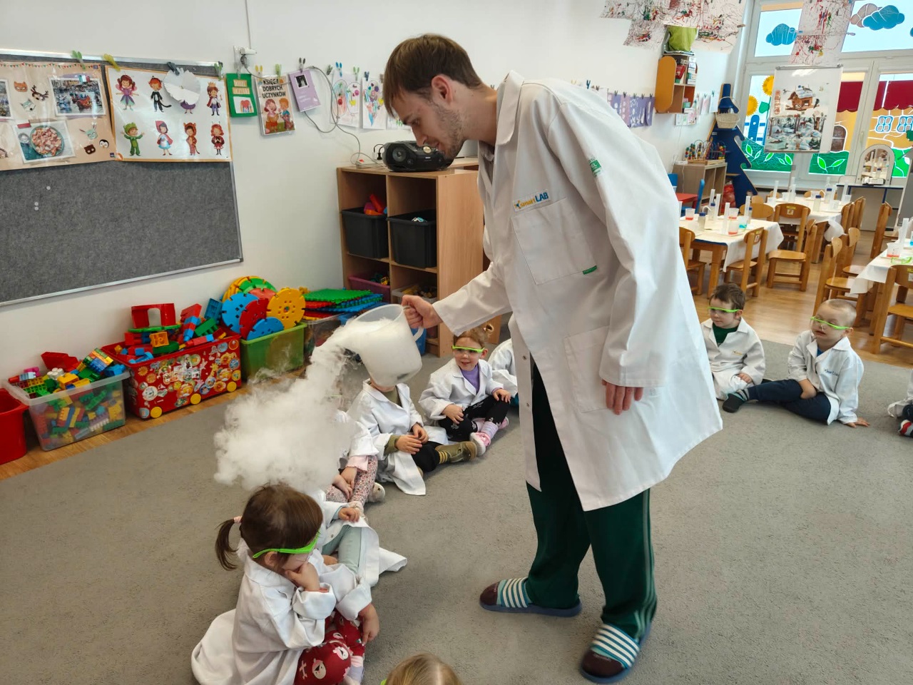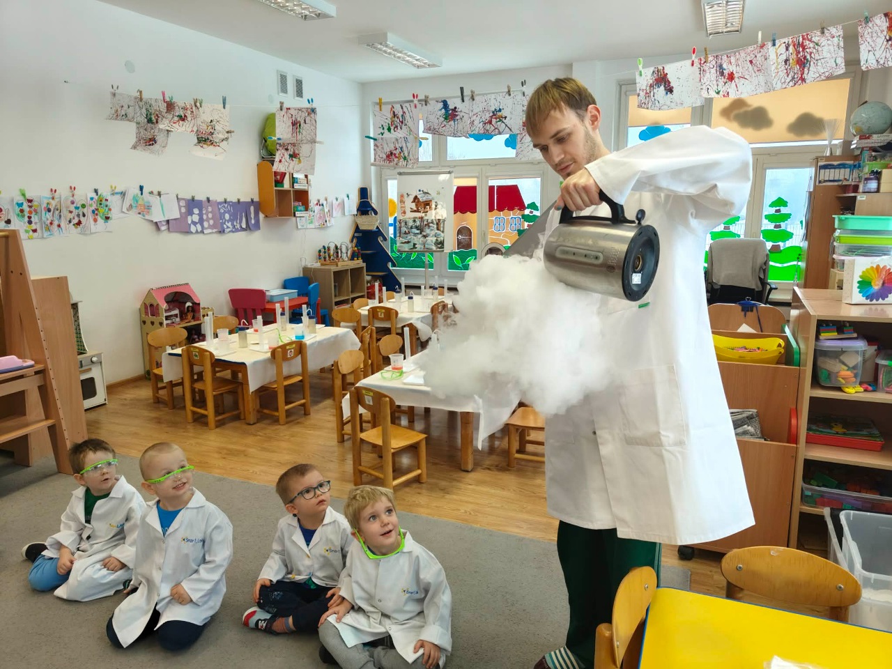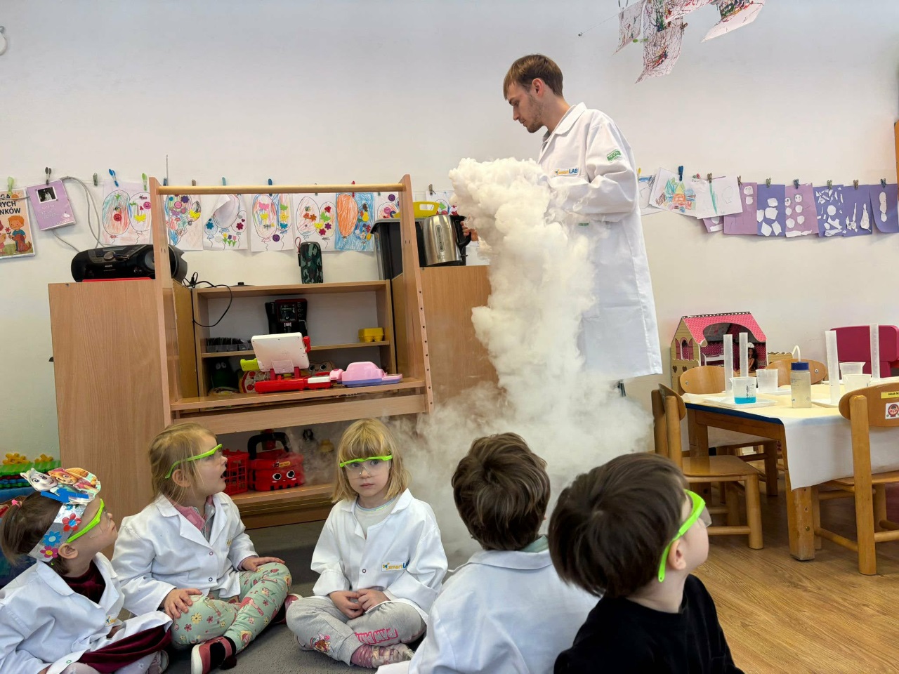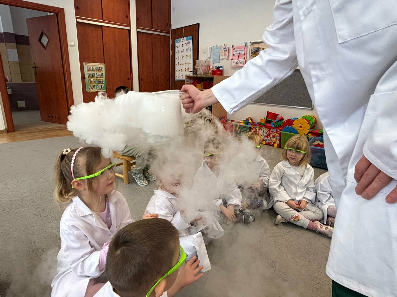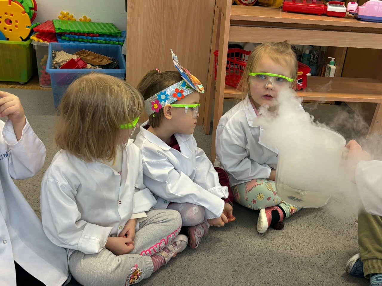 W dniu dziejszym Krasnoludki i Bajkoludki wzięły udział w warsztatach chemicznych zorganizowanych przez Centrum Edukacji SmartLab pt. "Suchy lód i magiczna chmurka".
